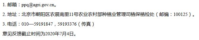 2020年6月4日,農(nóng)業(yè)農(nóng)村部種植業(yè)管理司起草了《一類農(nóng)作物病蟲害名錄(征求意見稿)》。2020年6月4日至2020年7月4日期間,公眾可通過郵箱、地址、電話等方式反饋意見。
